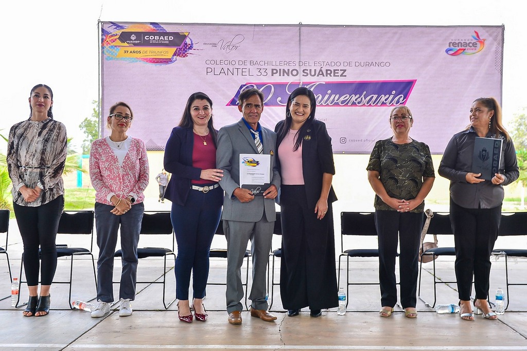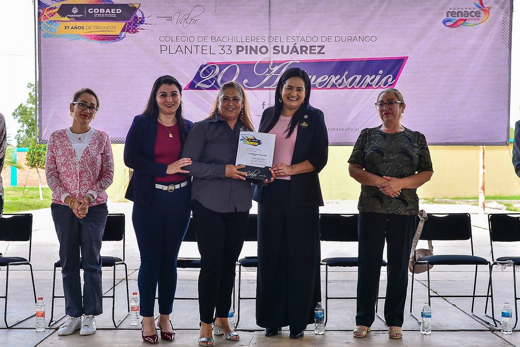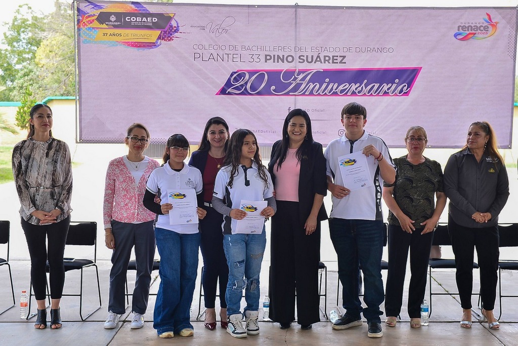 PINO SUÁREZ, DGO. — Con la participación de autoridades educativas, docentes, alumnos y padres de familia, el Colegio de Bachilleres del Estado de Durango, Plantel 33 Pino Suárez, celebró su vigésimo aniversario, refrendando su compromiso con la formación de jóvenes preparados, responsables y con visión de futuro.