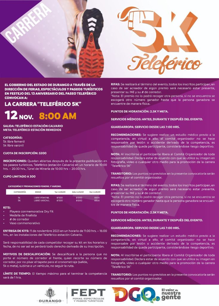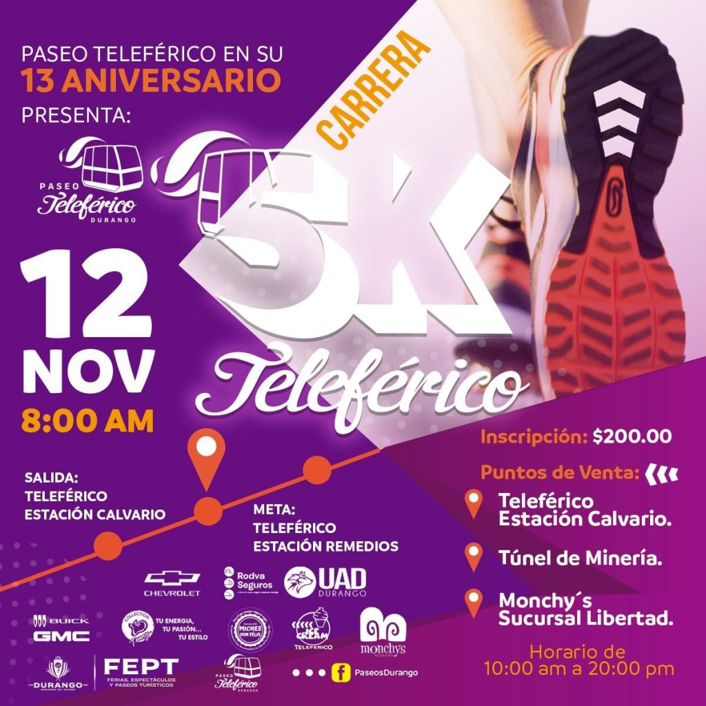 El Gobierno de Esteban Villegas invita a festejar el 13 aniversario del Teleférico en la ciudad de Durango, con la Carrera 5k, que organiza la dirección de Ferias, Espectáculos y Paseos Turísticos, este domingo 12 de noviembre en punto de las 8 horas, la cual promete ser un reto y una ruta divertida en ascenso hacia el Cerro de los Remedios.