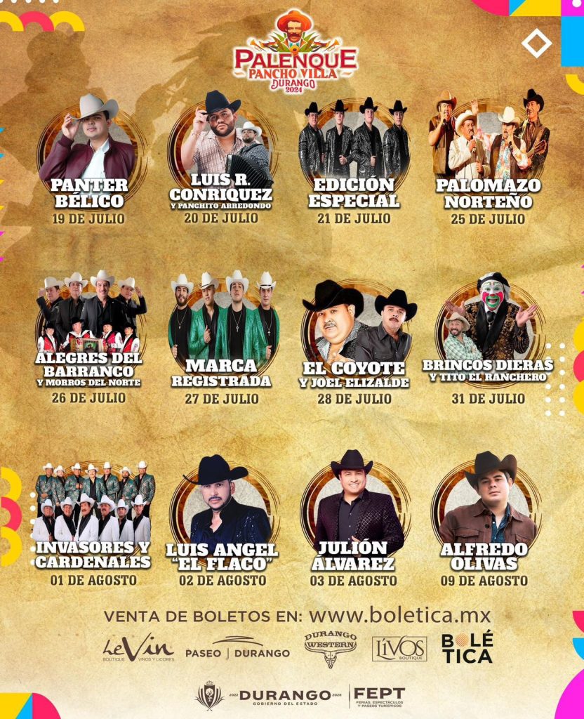 En el Palenque “Pancho Villa 2024”, se presentará el 19 de julio, Panter Bélico y el 20 de julio, Luis R. Conriquez y Panchito Arredondo; el 21 de julio Edición Especial, el 25 de julio el palomazo con Eliseo Robles, Lalo Mora, Raúl Hernández y Rosendo Cantú; mientras que el 28 de julio, podrán distrutar de Los Alegres del Barranco y Los Morros del Norte.