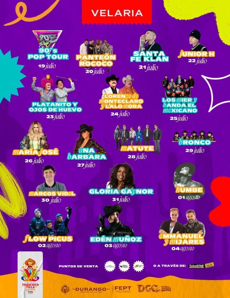 En la Velaria lucirán el 90’s Pop Tour, Panteón Rococó, Santa Fe Klan, Junior H, Platanito y Ojos de Huevo; Lorenzo de Monteclaro, Lalo Mora, Banda El Mexicano y Los Mier; María José, Ana Bárbara, Matute, Bronco y Marcos Vidal, así como Gloria Gaynor, Humbe, Flow Picus, Edén Muñoz, Emmanuel y Mijares.