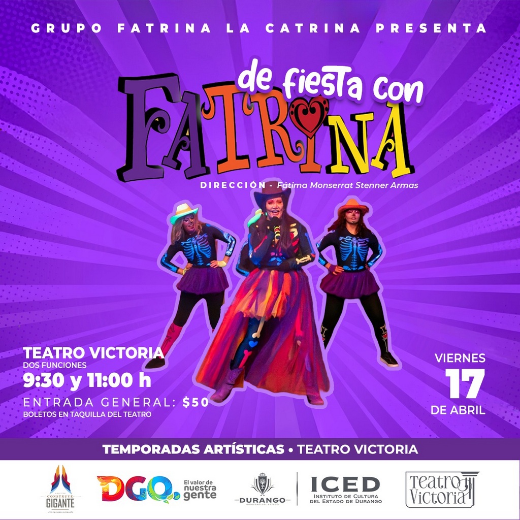 Las Temporadas Artísticas del Teatro Victoria, perteneciente al Instituto de Cultura del Estado de Durango (ICED), extienden una cordial invitación al público infantil y a sus familias para asistir y disfrutar del espectáculo multidisciplinario “De fiesta con Fatrina”, concierto infantil a cargo del Grupo Fatrina la Catrina, bajo la dirección de Fátima Monserrat Stenner Armas. Esta propuesta escénica está diseñada para brindar una experiencia lúdica y significativa que fomente la convivencia familiar y el acercamiento al arte desde edades tempranas.