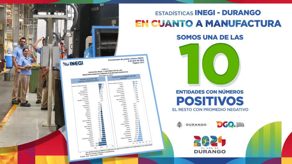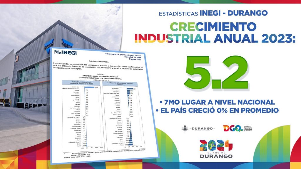 De acuerdo a datos del Instituto Nacional de Estadística y Geografía (INEGI), Durango registra un crecimiento anual en el 2023 del 5.2 por ciento y ocupa el séptimo lugar a nivel nacional, tomando en cuenta que el país, en promedio creció un 0%.