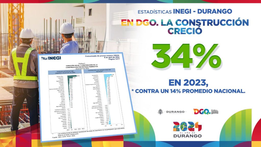 Hoy Durango está dentro de los 10 estados que muestran cifras positivas en la manufactura y en la construcción; creció un 34 % en 2023, contra un 14 % del promedio nacional y eso que aún no empiezan las construcciones grandes como las de empresas Solarever, SEV, Drotium y otras que van a traer mucha inversión privada en el tema de la construcción.
