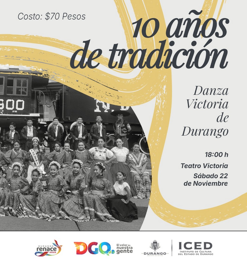 El Instituto de Cultura del Estado de Durango (ICED) reconoce con entusiasmo la primera década de trayectoria del Grupo Danza Victoria de Durango, dedicado a la promoción de la danza y el folclore mexicano. Desde su creación en 2015, se ha consolidado como una de las agrupaciones más representativas del estado, brindando formación y espacio de expresión a decenas de niños y jóvenes duranguenses. Su pasión por la danza ha llevado el nombre de Durango a escenarios locales y nacionales.