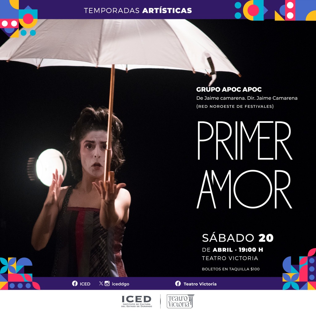 El sábado 20 de abril, a las 19:00 h se abre el telón para “Primer Amor”, con la Dirección de Jaime Camarena, de Apoc Apoc, cooperación $100.00. El protagonista es un indigente desarrapado con serios problemas de comunicación con sus semejantes. Un día conoce a una mujer en un parque y, de una forma extraña siente que la llama del amor ha prendido en él. Inspirada en un cuento de Samuel Beckett, la pieza, es una paráfrasis que describe a partir de este encuentro amoroso, el desarrollo imaginado por el autor de la obra, en el devenir de estos seres, que comparten su destino, como un continuo comienzo. Para toda la familia.