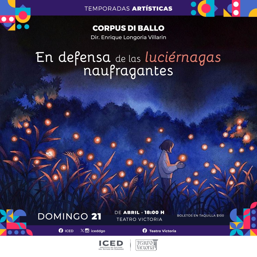 El domingo 21 de abril, a las 18:00 h., la Compañía Corpus di ballo bajo la dirección de Enrique Longoria Villarin, presenta “En defensa de las luciérnagas naufragantes”, cooperación de $100.00. Un grupo de náufragos buscan llegar a Tierra firme, a la vez que cuestionan si no hubiera sido mejor unas luciérnagas que iluminaran la oscuridad de altamar, para así poder resplandecer y encontrar una forma de sobrevivir al naufragio humano. Apta para todo público.