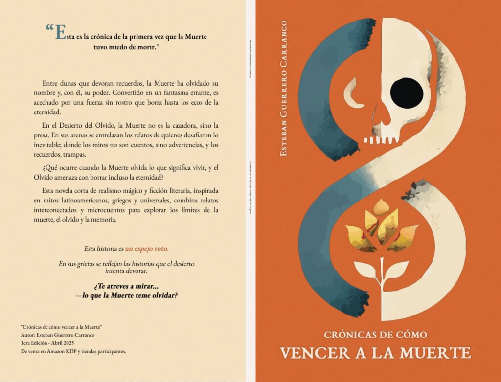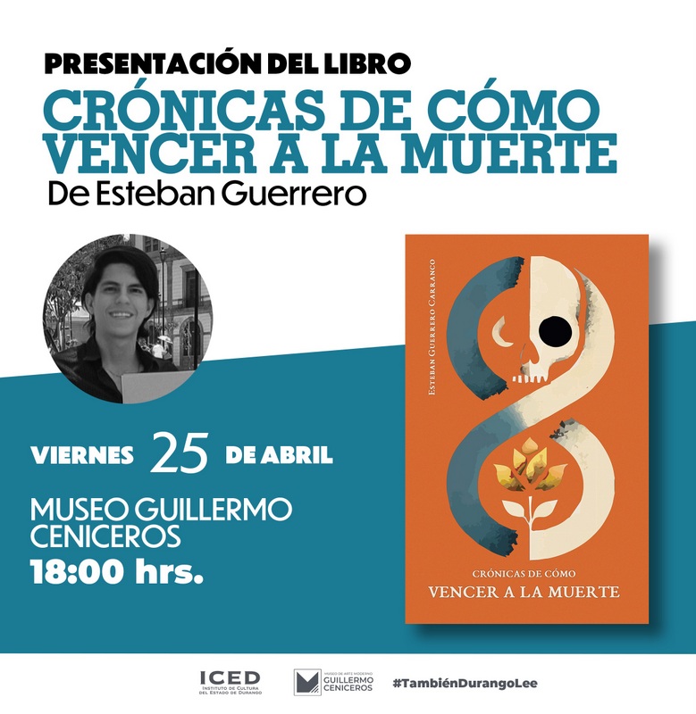 El viernes 25 de abril a las 18:00 horas, se presentará el libro “Crónicas de cómo vencer a la muerte”, del joven autor Esteban Guerrero Carranco, de 29 años y originario de Durango. Guerrero ha trabajado en importantes producciones audiovisuales para plataformas como Netflix, HBO, Disney+, Star+ y Prime Video. Su obra literaria, una novela corta de realismo mágico y ficción literaria, explora la muerte, el olvido y la memoria, entretejiendo mitos latinoamericanos, griegos y universales en relatos y microcuentos interconectados.