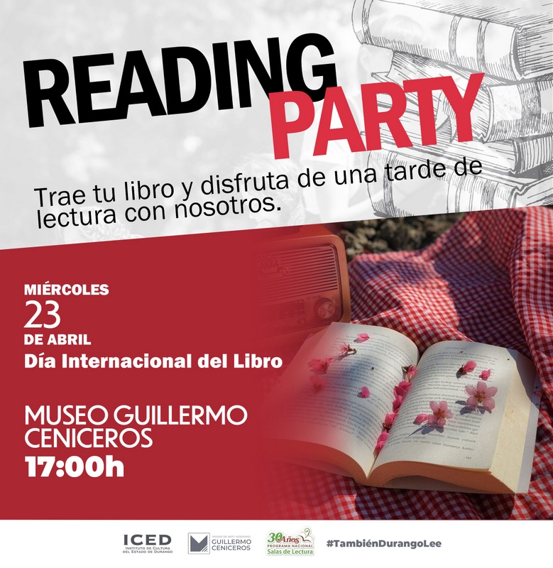 En el marco del Día Internacional del Libro y como parte de las actividades culturales del Instituto de Cultura del Estado de Durango (ICED), el Museo de Arte Moderno Guillermo Ceniceros será sede de tres importantes eventos literarios los días 23, 25 y 26 de abril, que incluyen la primera fiesta de lectura en Durango y dos presentaciones de libros de autores duranguenses.