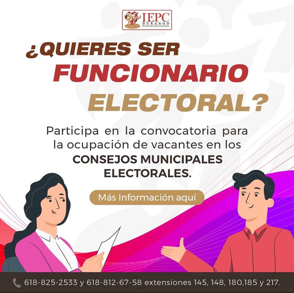 En seguimiento a las actividades que se implementan para el desarrollo del Proceso Electoral Local, se aprobó el Acuerdo del Consejo General del IEPC, por el que se emite la Convocatoria para ocupar cargos vacantes de los 39 Consejos Municipales Electorales en Durango para dos procesos electorales locales; la información sobre los requisitos que tendrán que cumplir quienes estén tengan el interés en participar, están disponibles para su consulta en la página de internet www.iepcdurango.mx y en las redes sociales de la Institución.