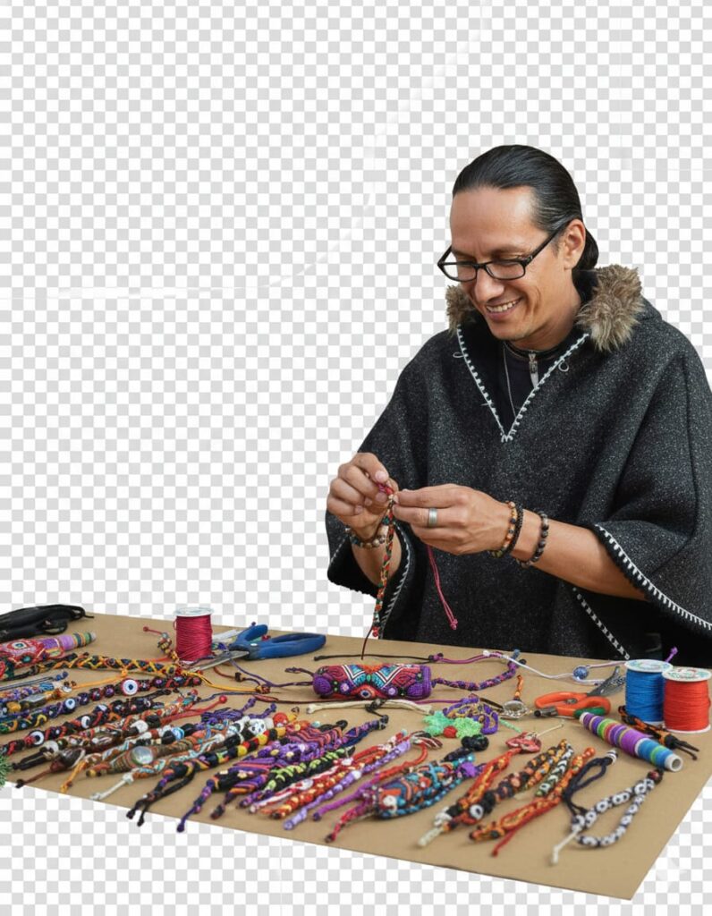 La especialidad de Fernando García es la elaboración de pulseras, dijes y collares trabajados con técnicas minuciosas que combinan alambre, chaquira, hilos y otros materiales tradicionales. Cada una de sus piezas refleja paciencia, creatividad y un estilo propio que destaca por sus detalles finos, combinaciones armoniosas de color y un diseño cuidadosamente elaborado.