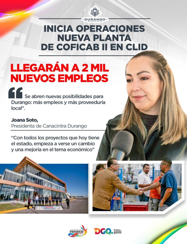 Joana Soto, presidenta de Canacintra Durango, destacó que, con el impulso del gobernador Esteban Villegas, el inicio de operaciones de Coficab II en el CLID abre nuevas posibilidades para el estado, con más empleos y mayor proveeduría local, y afirmó que los proyectos en marcha ya reflejan un cambio positivo y una mejoría en la economía de Durango.
