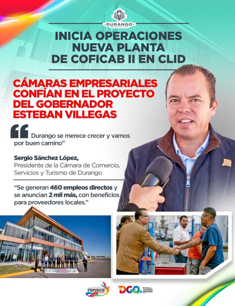 Sergio Sánchez López, presidente de la Cámara de Comercio, Servicios y Turismo de Durango, señaló que, con el respaldo y la visión del gobernador Esteban Villegas, Durango va por buen camino en su crecimiento económico, al destacar que la nueva planta de Coficab II en el CLID genera 460 empleos directos y anuncia 2 mil más, con beneficios para proveedores locales y la economía del estado.