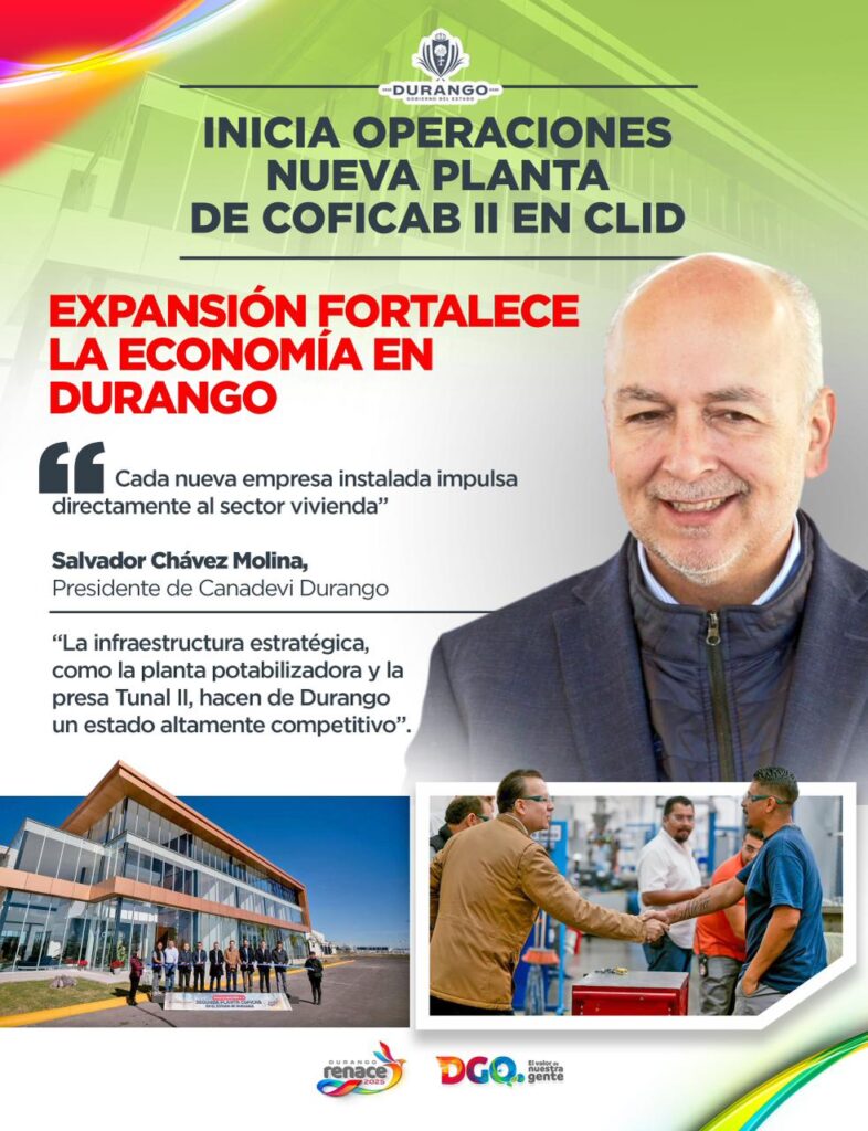 Salvador Chávez Molina, presidente de Canadevi Durango, señaló que, con la visión y el impulso del gobernador Esteban Villegas, la expansión de Coficab II en el CLID fortalece la economía del estado al impulsar directamente al sector vivienda, y destacó que la infraestructura estratégica, como la planta potabilizadora y la presa Tunal II, posicionan a Durango como un estado altamente competitivo.
