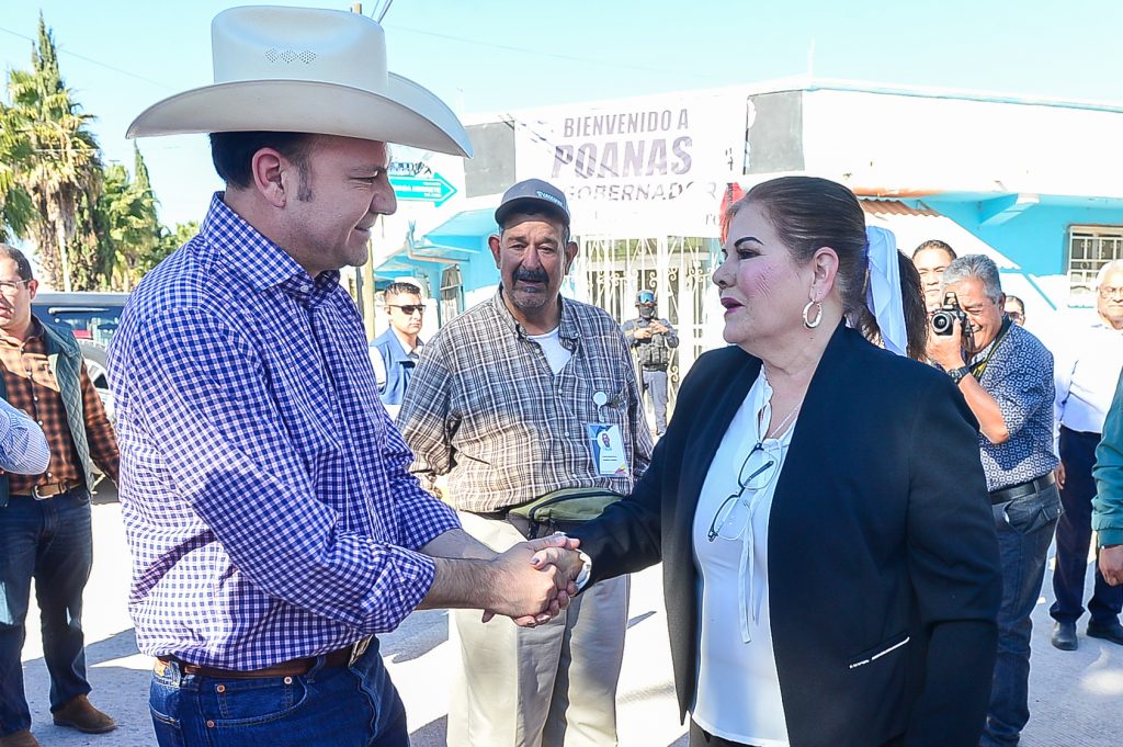 En su visita a Poanas, entregó las calles Negrete, Pino Suárez y 20 de Noviembre; además de un cheque por 542 mil 500 pesos correspondientes a la regularización de vehículos de procedencia extranjera; dotó de alrededor de tres mil paquetes de útiles escolares a estudiantes y una patrulla para reforzar la seguridad e integridad de los poanenses.