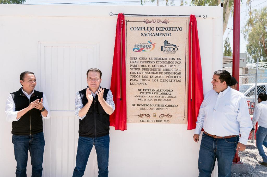 Lerdo, Dgo.– “Este espacio es para ustedes, para sus familias, para rescatar la convivencia, los valores y el deporte”, expresó el gobernador Esteban Villegas Villarreal al inaugurar junto al alcalde Homero Martínez Cabrera el nuevo Complejo Deportivo Sacramento, un espacio familiar que ya es realidad para cientos de lerdenses.