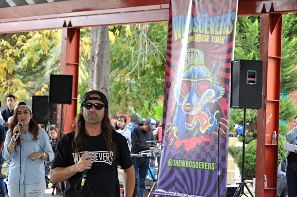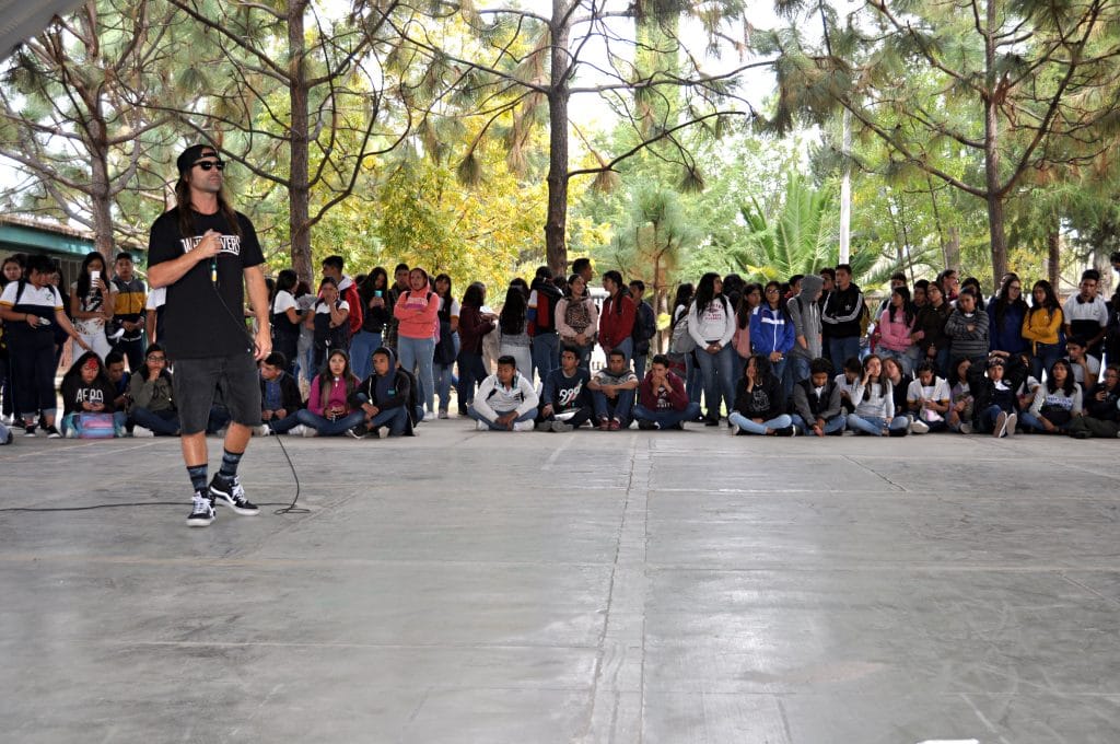 Un mensaje inspirador fue el que recibieron los estudiantes del plantel 32 Juana Villalobos de ambos turnos, logrando concentrar a 1450 estudiantes que escucharon el testimonio de este músico, compositor y arreglista que compartió su experiencia de vida al estar inmerso en el mundo de las drogas, llegando al extremo de intentar suicidarse y cómo este límite en su vida lo ayudó a tomar impulso para retomar sus ganas de vivir, haciendo música, skate, formar una familia y otras actividades que lo apasionan.