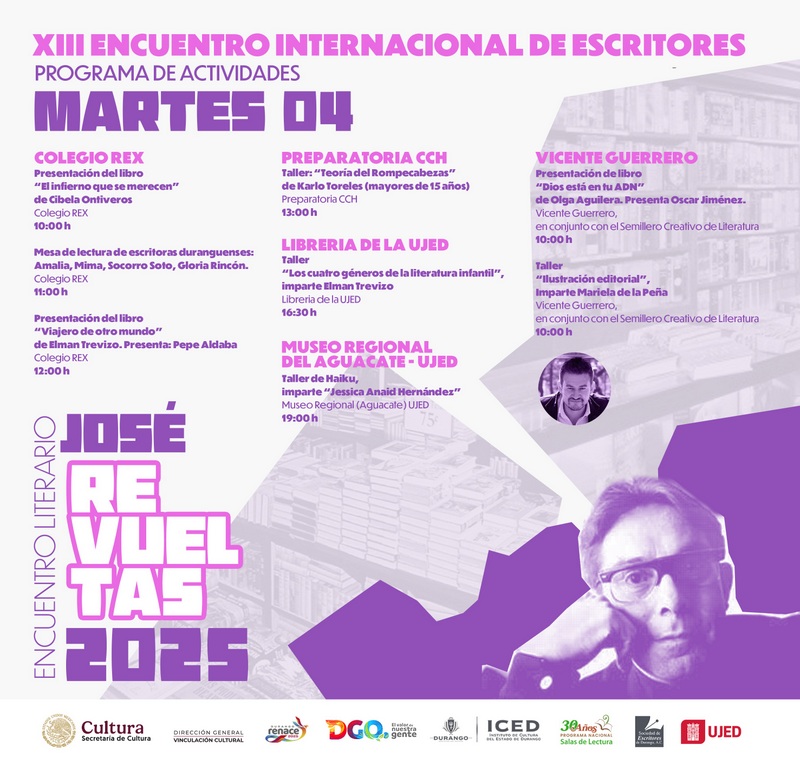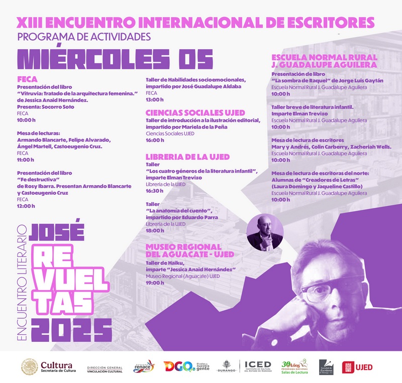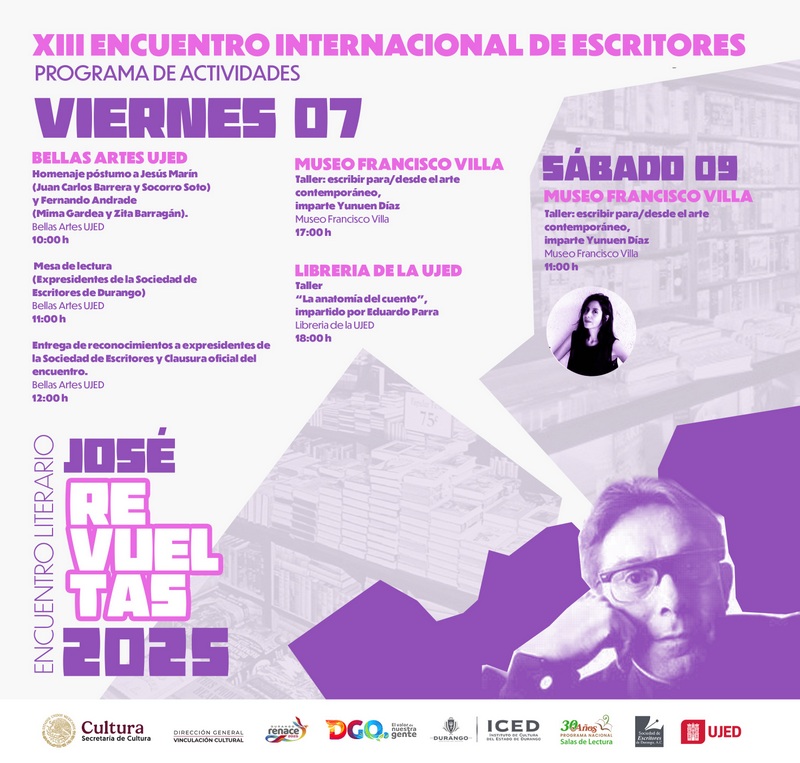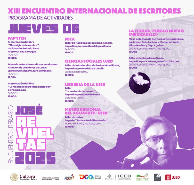 En el marco de tal relevancia literaria, se ofrece una cartelera que con actividades que cuentan en la primera semana de noviembre con el XIII Encuentro Internacional de Escritores «José Revueltas», que se desarrollará en recintos culturales, escuelas y sedes alternas en municipios como: Vicente Guerrero, Canatlán y Pueblo Nuevo. Tiene como invitados especiales a autores como Colin Carberry (Irlanda, poeta), Zachary Wells (Canadá, poeta), Yunuen Díaz (CDMX, ensayista), Eduardo Antonio Parra (CDMX, narrador), Jessica Anaid Hernández (Chihuahua, poeta), Elman Trevizo (Chihuahua, literatura infantil), autores que ofrecerán un rico programa que incluye talleres literarios y lecturas públicas.