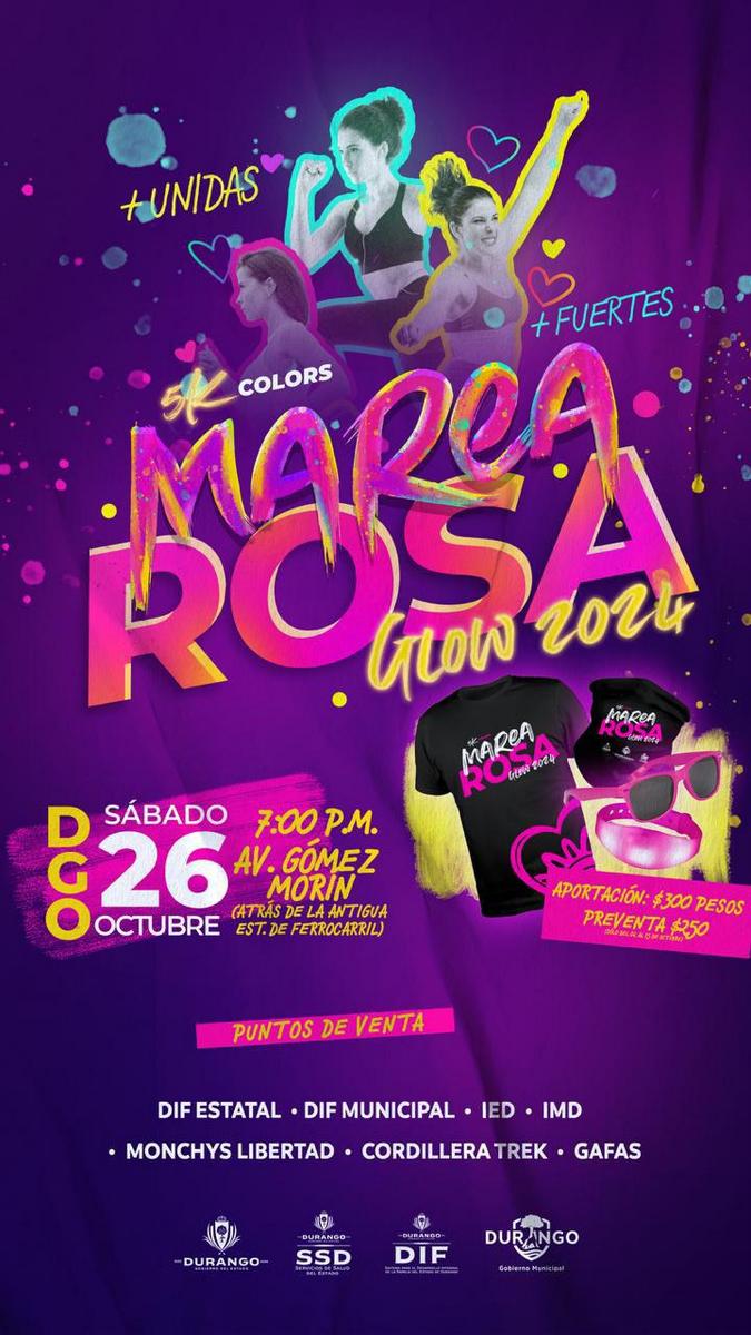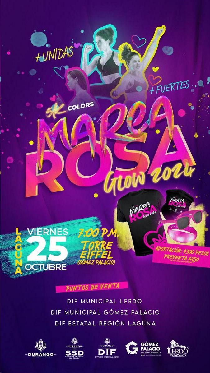 Durango y La Laguna se vestirán de luz neón en esta edición de la Marea Rosa, ya que por primera vez el recorrido será por la noche, destacó Rosso Rivera, al informar que en la Comarca Lagunera, la carrera de convivencia se llevará a cabo el viernes 25 de octubre; la salida y meta será en la Torre Eiffel ubicada en bulevar González de Vega de Gómez Palacio en punto de las 19:00 horas. En la capital, se realizará el sábado 26 de octubre a las 19:00 horas, teniendo como escenario el bulevar Gómez Morín.
