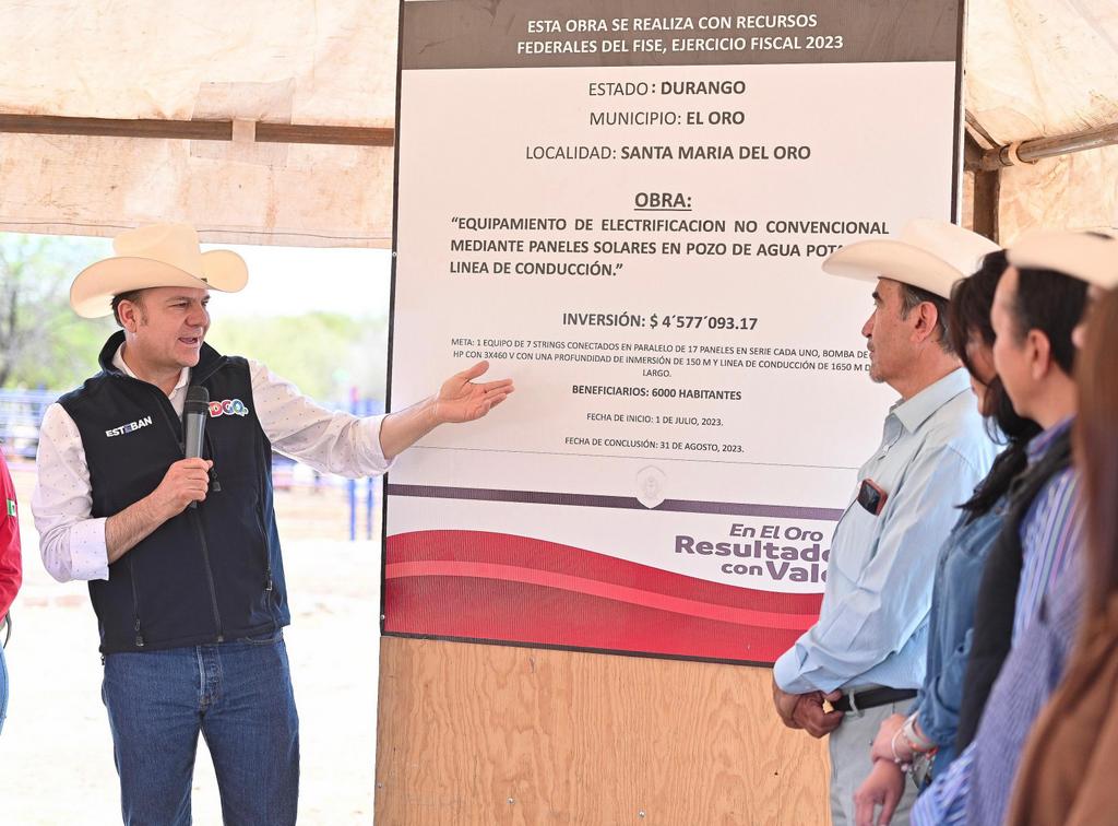 El gobernador Esteban Villegas Villarreal realizó una gira de trabajo por el municipio del Santa María del oro, donde supervisó el funcionamiento del pozo de agua potable y la línea de conducción con equipamiento de electrificación no convencional mediante paneles solares, el cual lleva una inversión de 4.5 millones de pesos y un beneficio para 600 habitantes.