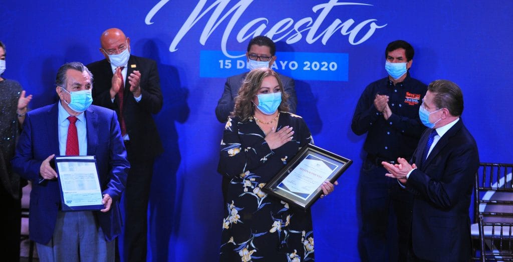 En el evento conmemorativo al Día del Maestro, el Gobernador entregó reconocimientos por años de servicios a las maestras María del Carmen Lomelí de la región Laguna y a María del Sol Delgado de Durango, celebración a la que también se dieron cita, cumpliendo con los protocolos marcados por las Secretaria de Salud, el titular del Tribunal Superior de Justicia, Esteban Calderón Rosas y la diputada local, María Elena González.