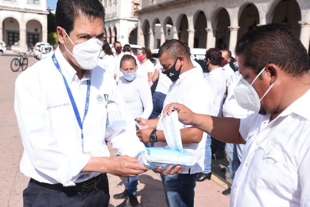 La Plaza IV Centenario fue la mañana de este miércoles, escenario para la celebración de una protocolaria ceremonia con un puñado de conductores de los sindicatos CTM, Mixtos y Taxi Mujer a quienes se les entregó material para que sea utilizado en sus unidades, en el caso del gel, y además se proporcionó cubre bocas para los propios usuarios, que, lejos de negarles el servicio por falta del mismo, se les proporcione en la misma unidad.