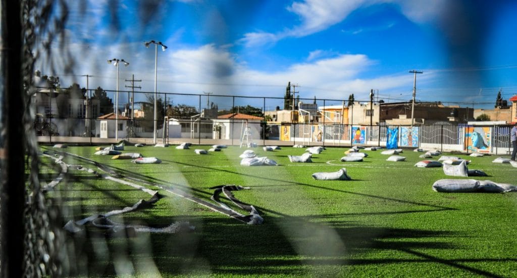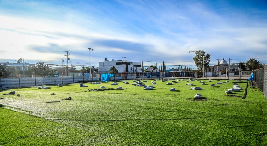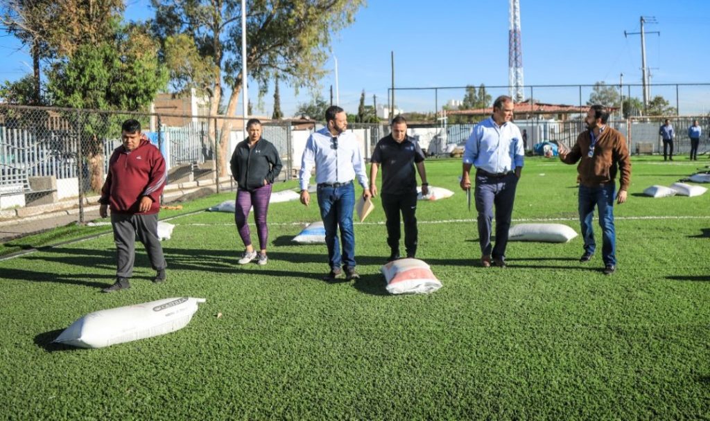 El Presidente Municipal constató la rehabilitación de la cancha de futbol 7, a la cual se le cambió el pasto sintético, redes, malla ciclónica de alrededor y aplicación de arena y caucho para mayor durabilidad.