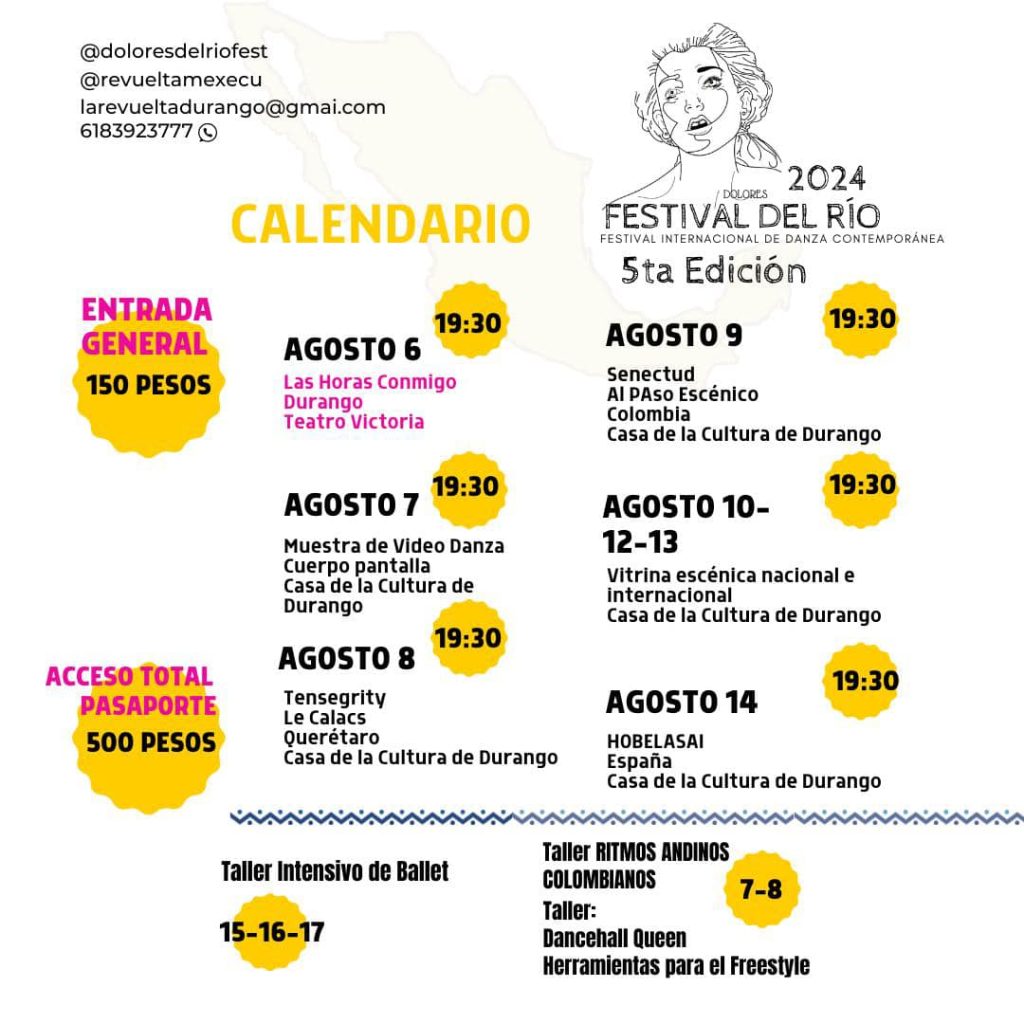 También se ofrecerán el taller de Dancehall Queen, Herramientas para el Freestyle los días 7 y 8 de agosto y el taller intensivo de Ballet los días 15, 16 y 17 de agosto. Los informes se pueden solicitar al whatsapp 618 392 37 77 o en las redes sociales de la Casa de la Cultura Durango sobre el V Festival Internacional de Danza Contemporánea Dolores del Río 2024.